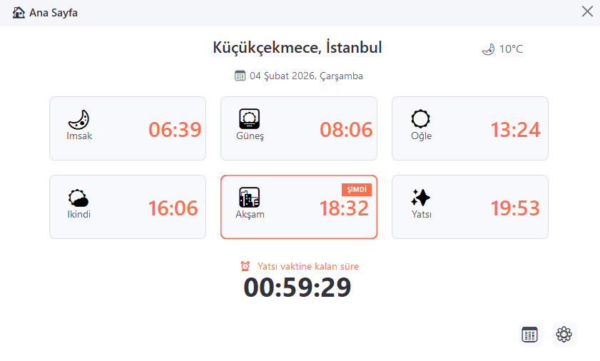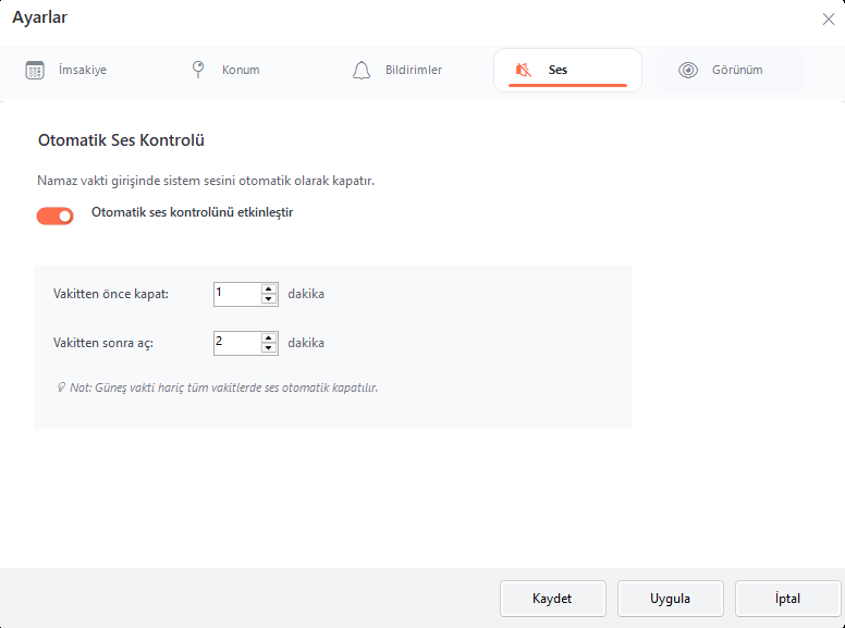 - 🔇 Otomatik Ses Kontrolü: Vakit girişinde sistem sesini otomatik kapat/aç